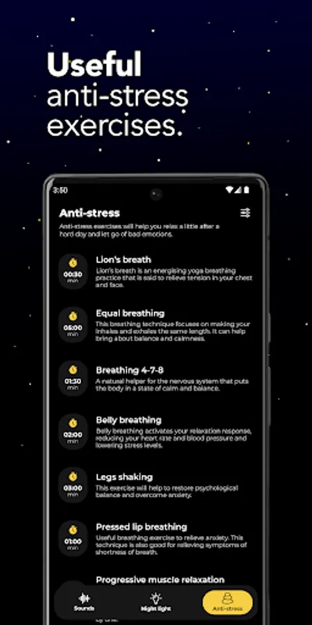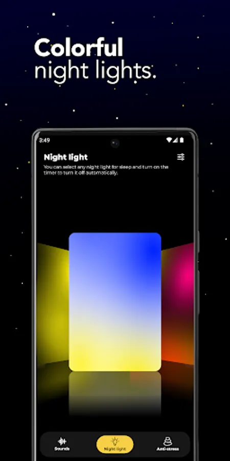 Enhance your sleep further with the app's range of night lights that use your device's screen to create a calming and customizable atmosphere. Choose from a variety of colors and patterns to help you relax and unwind. And with the handy shutdown timer, you can set it to turn off after a certain amount of time.
