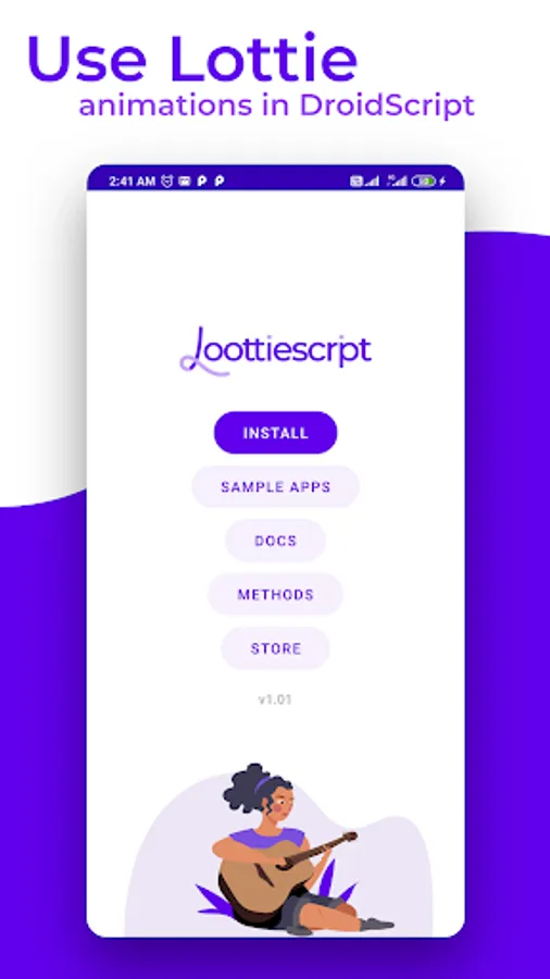 LottieScript allows you to use Lottie and Bodymovin animations JSON file inside the DroidScript app as a plugin. You can use LottieScript plugin and create lottie view controls and play animated JSON files. LottieScript app allows you to install Lottie view plugin to the DroidScript and also contains documentation about how to use the plugin. Also contains some sample scripts to get started with.