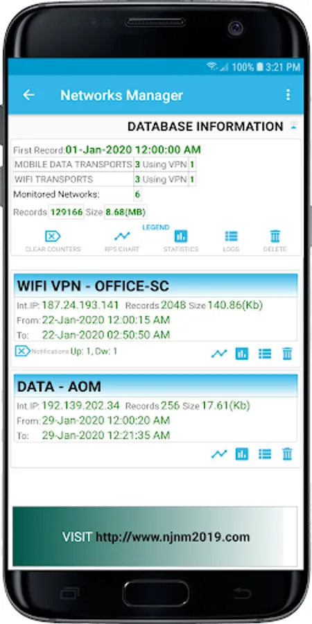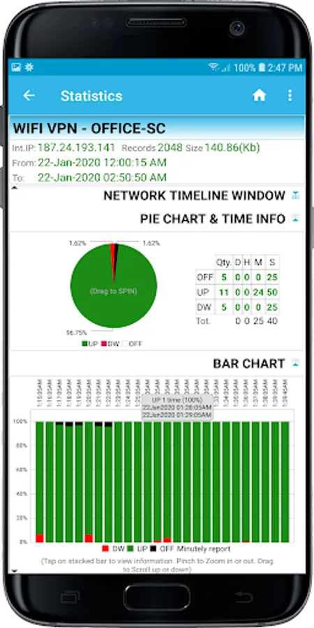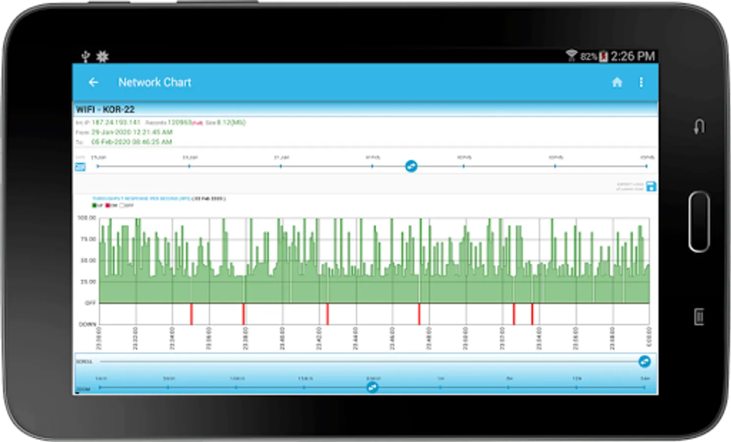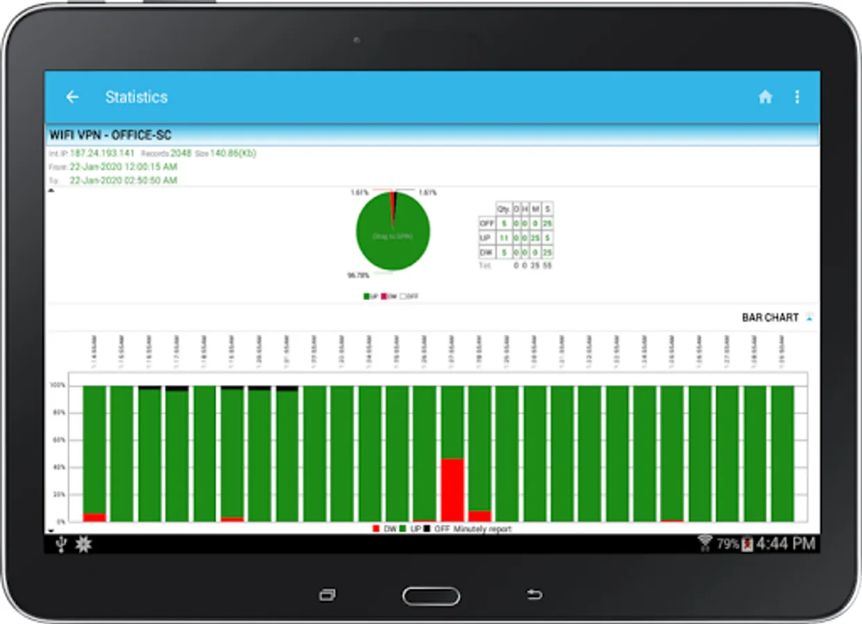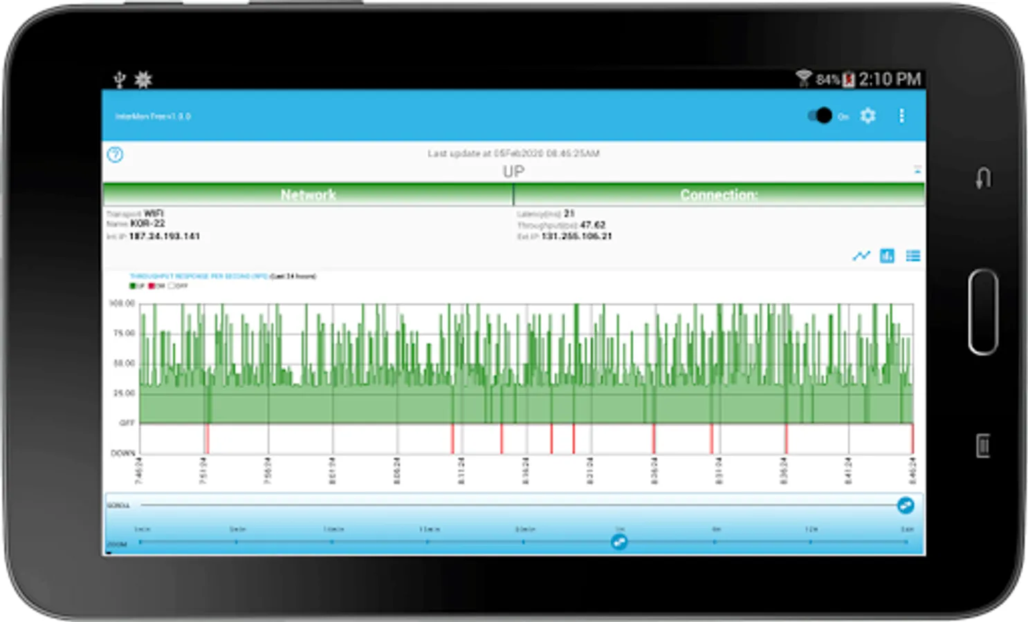 Regardless of the type of contract you have, either by Wifi or by Data, InterMon uses your Internet connection to ask a simple question called "PING" to a server on the network and record the time it took to give the answer called "LATENCY". In the same way, InterMon records every time there is no Internet or every time the user turns off their Wifi or Data. All this process is done with a user programmable sampling rate that varies between 5 to 60 seconds (12SPM* to 1SPM*) through a 24/7 low power service that "does not drain your battery".