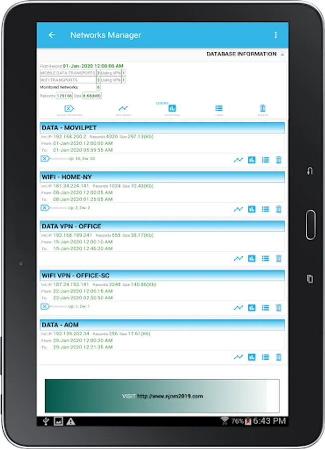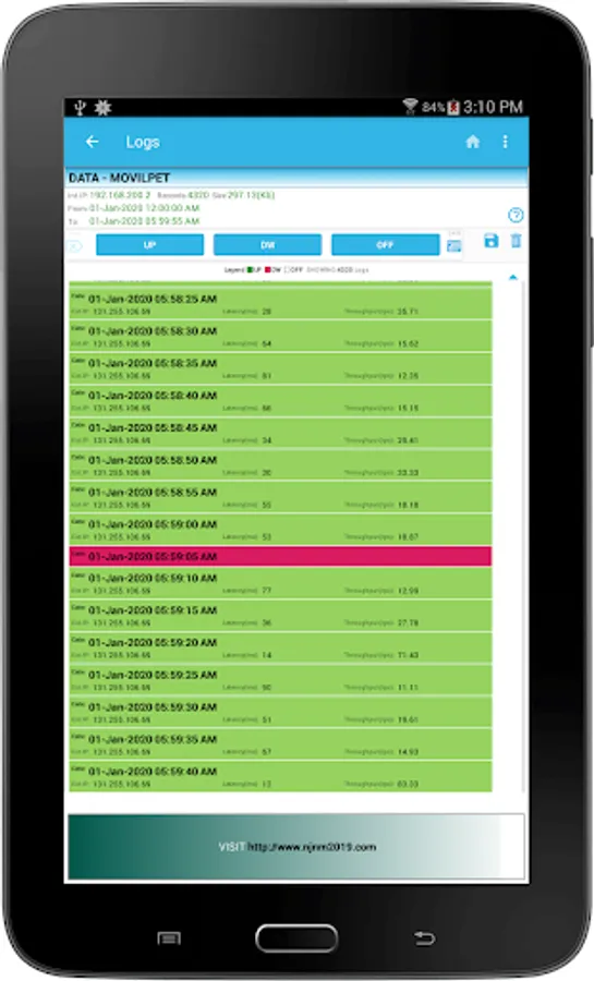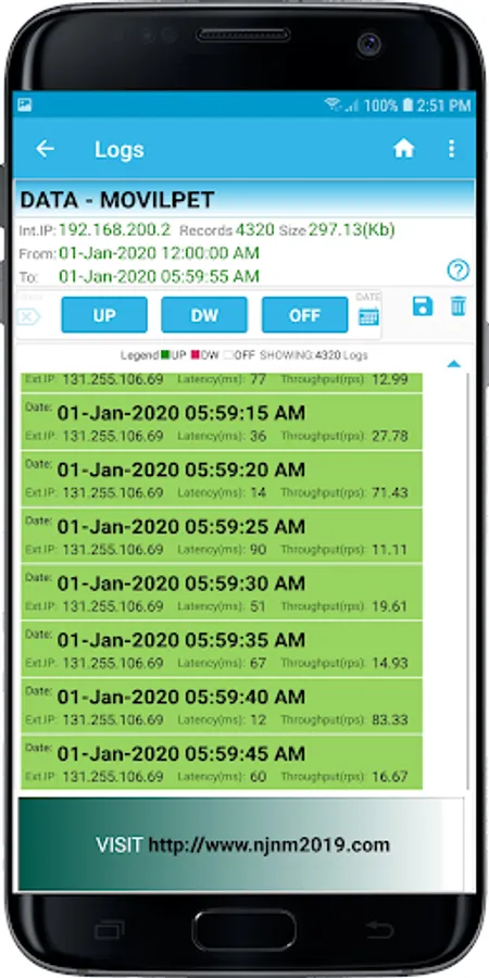 • List of all logs by date and colors according to the connection status. Public IP, Latency and RPS*, filters by dates using floating datepicker and filter by events.