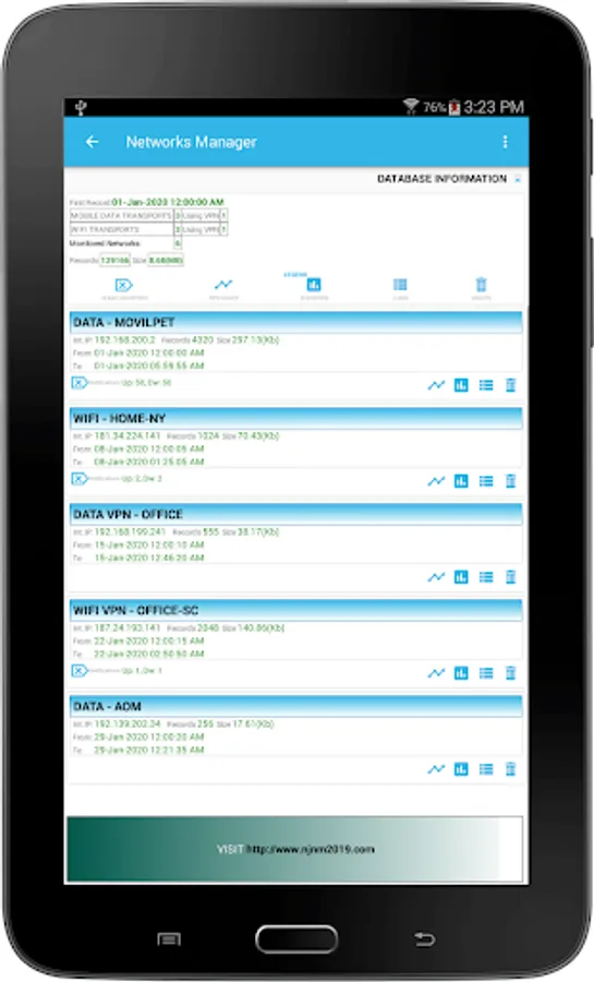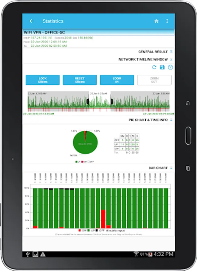 • Interactive Statistics Pie and Bar charts, connections time’s summary, network time line window selector and layouts controls buttons.