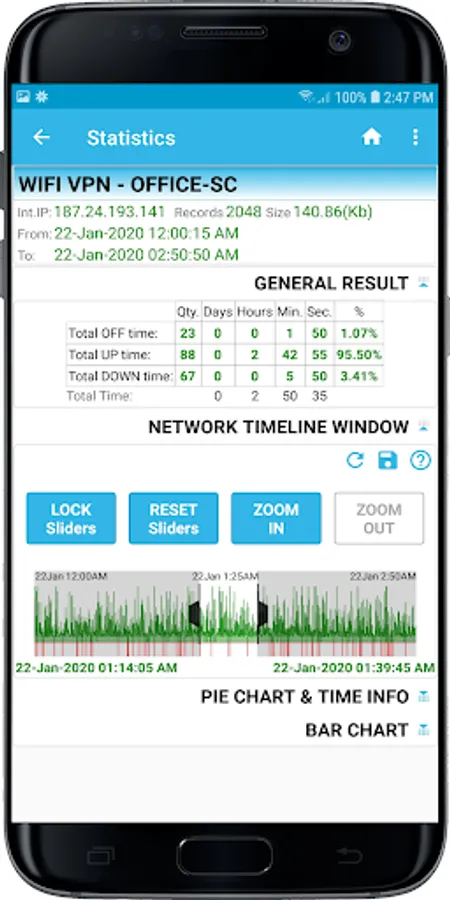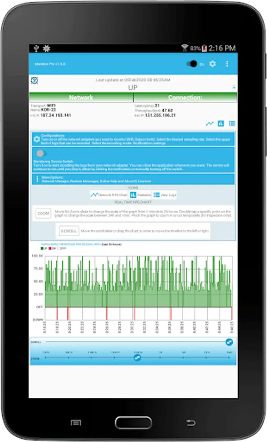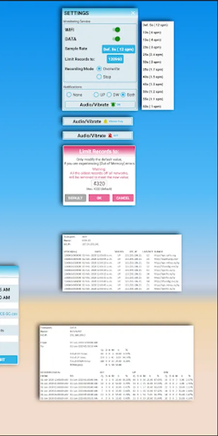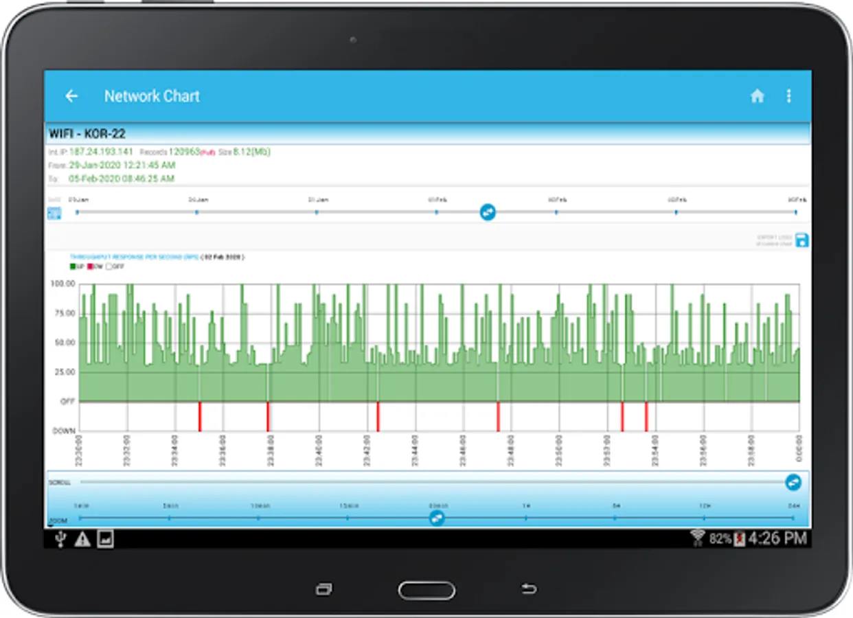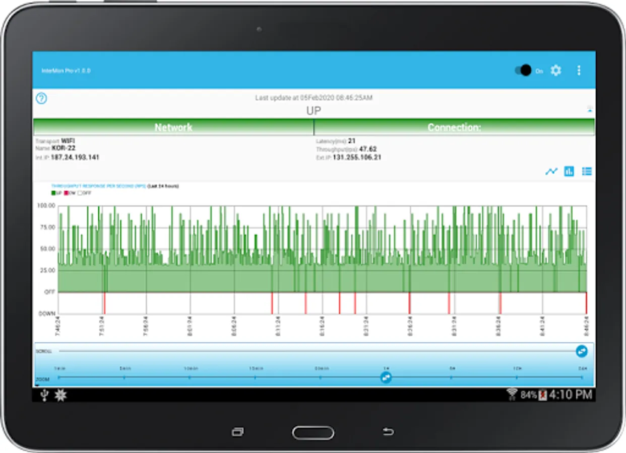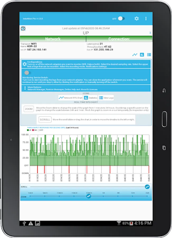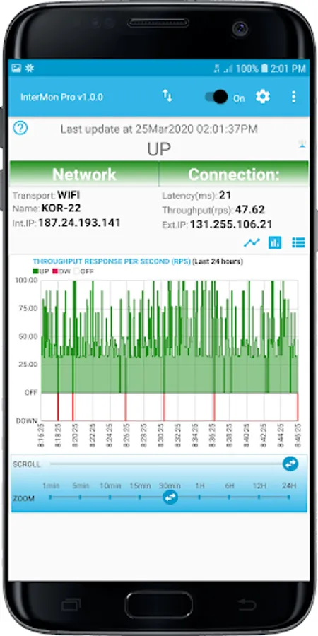 Regardless of the type of contract you have, either by Wifi or by Data, InterMon uses your Internet connection to ask a simple question called "PING" to a server on the network and record the time it took to give the answer called "LATENCY". In the same way, InterMon records every time there is no Internet or every time the user turns off their Wifi or Data. All this process is done with a user programmable sampling rate that varies between 5 to 60 seconds (12SPM* to 1SPM*) through a 24/7 low power service that "does not drain your battery".