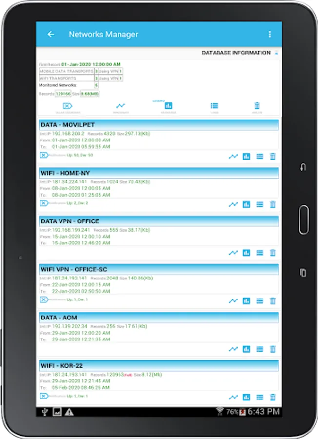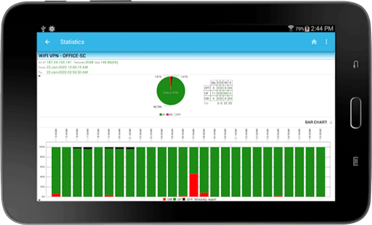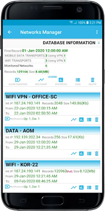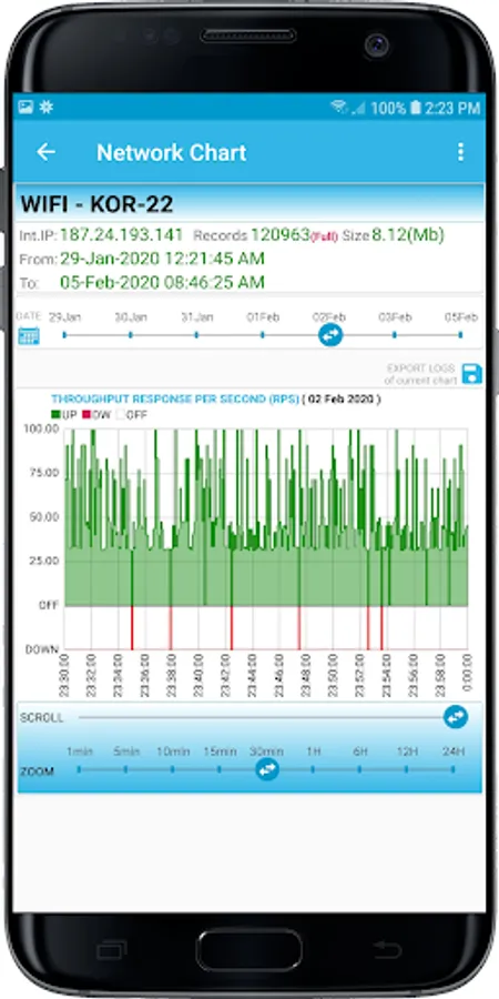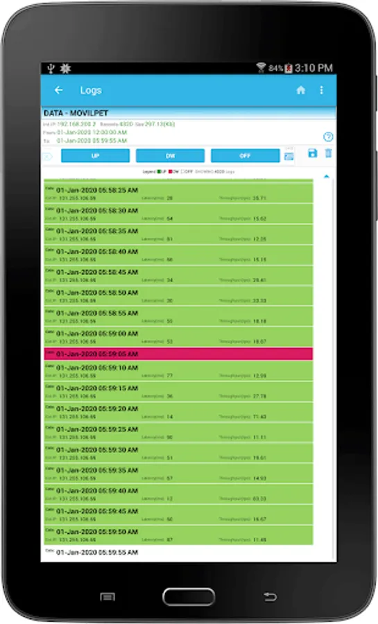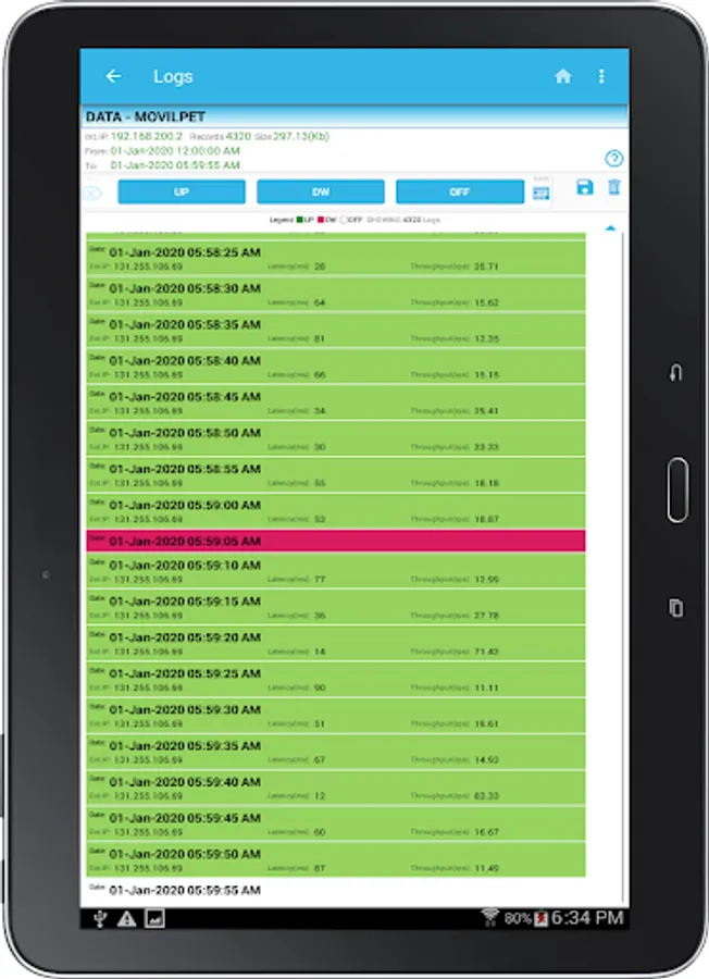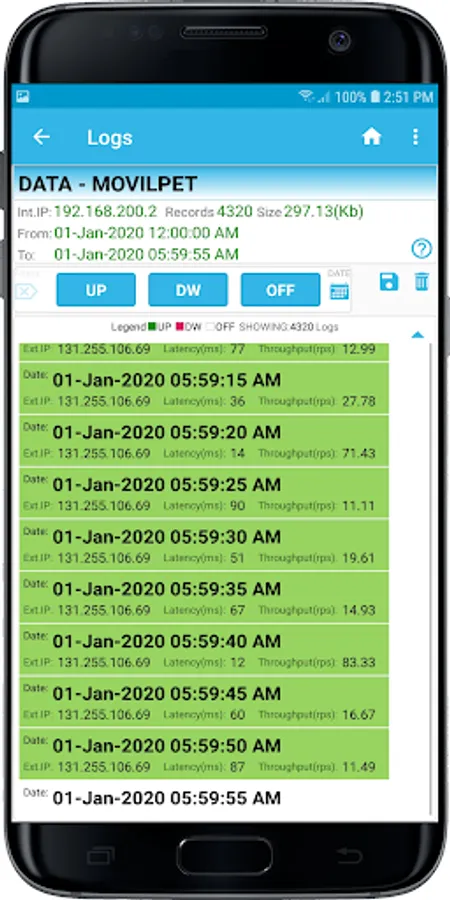 • List of all logs by date and colors according to the connection status. Public IP, Latency and RPS*. Filters by dates using floating datepicker and filter by events.