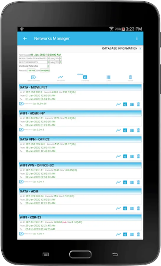 • Interactive Statistics Pie and Bar charts, connections time’s summary, network time line window selector and layouts controls buttons.