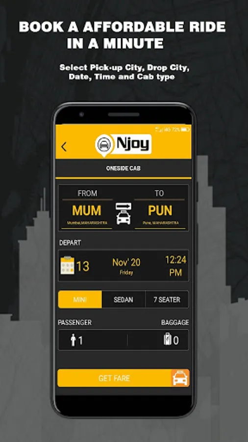 Our app is easy to download and user friendly. Just choose type of ride and select start and end city with the car you want. In just a few minutes the cab will be at your place.