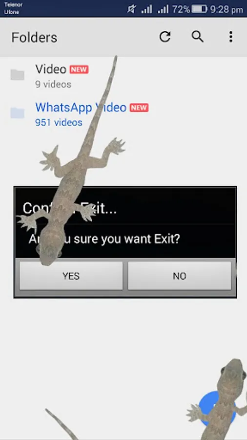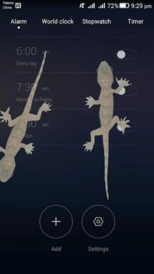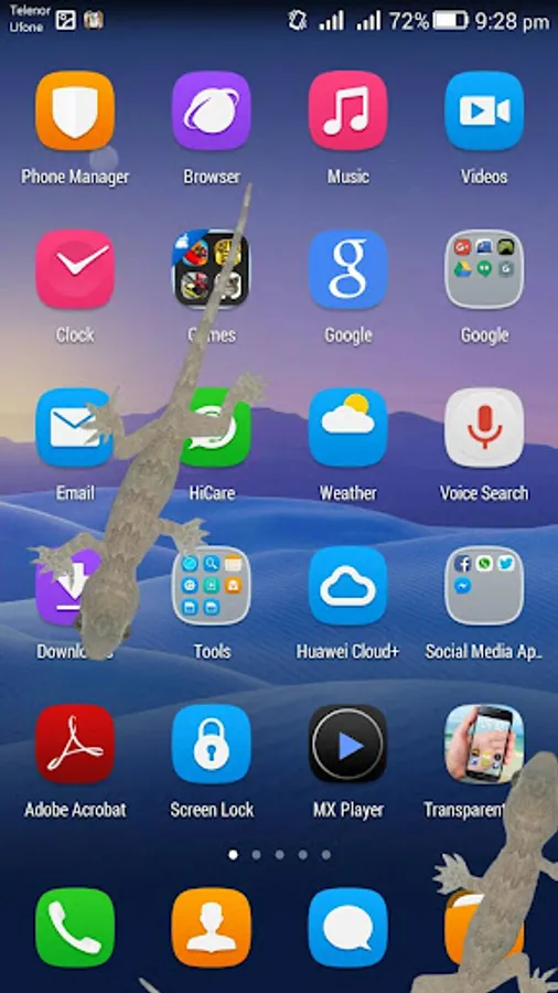 Animation of lizard is displayed on transparent background and on the top of all running programs in phone even over the Lock Screen.