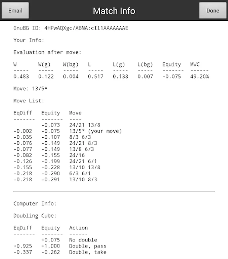 • Match info: GnuBG ID, win chances, equity, top 10 moves, & cube decisions