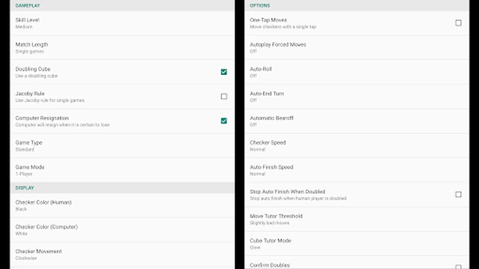 • Options to reverse board direction, resign, use one-tap moves, auto bearoff, auto finish, use Jacoby rule, & much more