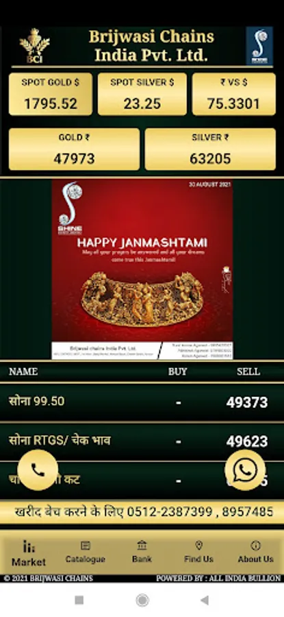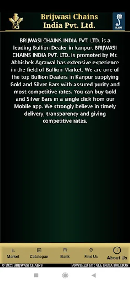 Brijwasi Chains India Pvt. Ltd. is a leading Bullion Dealer in Kanpur. Brijwasi Chains India Pvt. Ltd. is promoted by Mr. Abhishek Agrawal has extensive experience in the field of Bullion Market. We are one of the top Bullion Dealers in Kanpur supplying Gold and Silver Bars with assured purity and most competitive rates. You can buy Gold and Silver Bars in a single click from our Mobile app. We strongly believe in timely delivery, transparency and giving competitive rates.