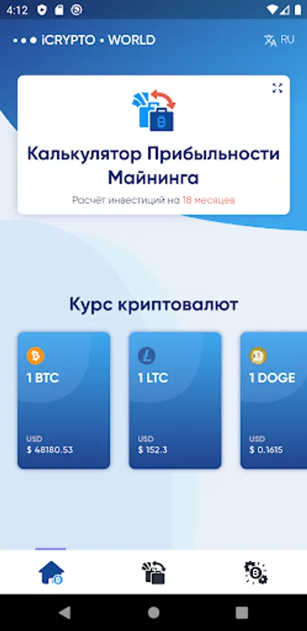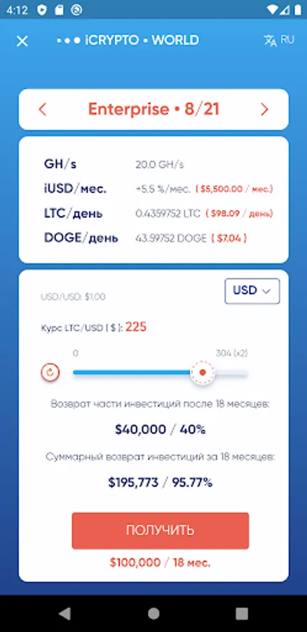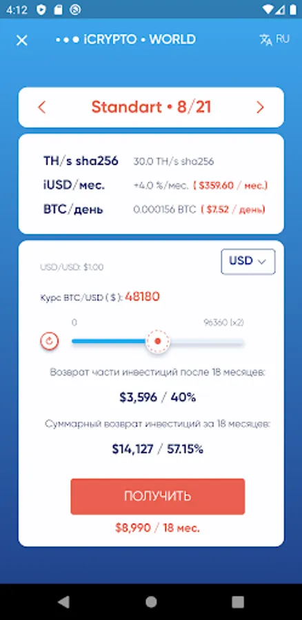 ICryptoWorld Profitability Calculator. Calculate the profitability, depending on the chosen package and the cryptocurrency rate.