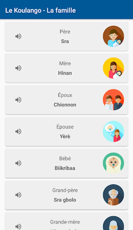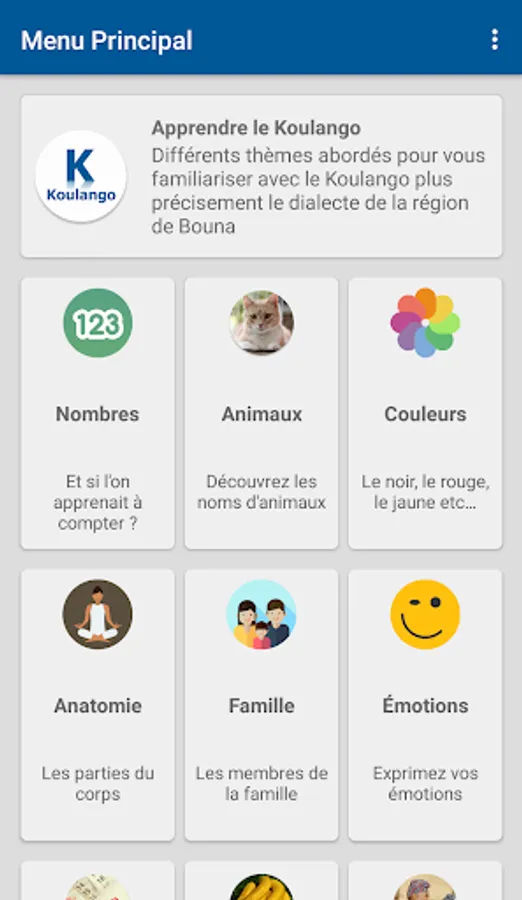 Learn Koulango is an application that will allow you to familiarize yourself with the Koulango more precisely the dialect of the region of Bouna.