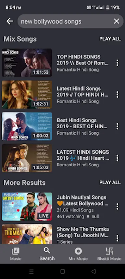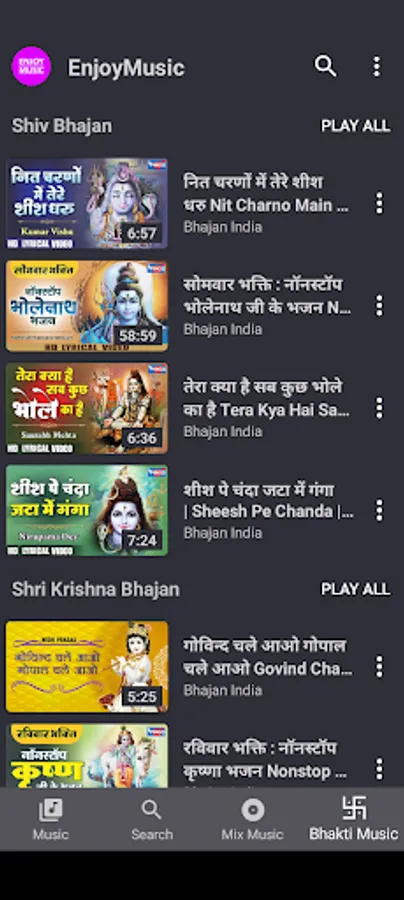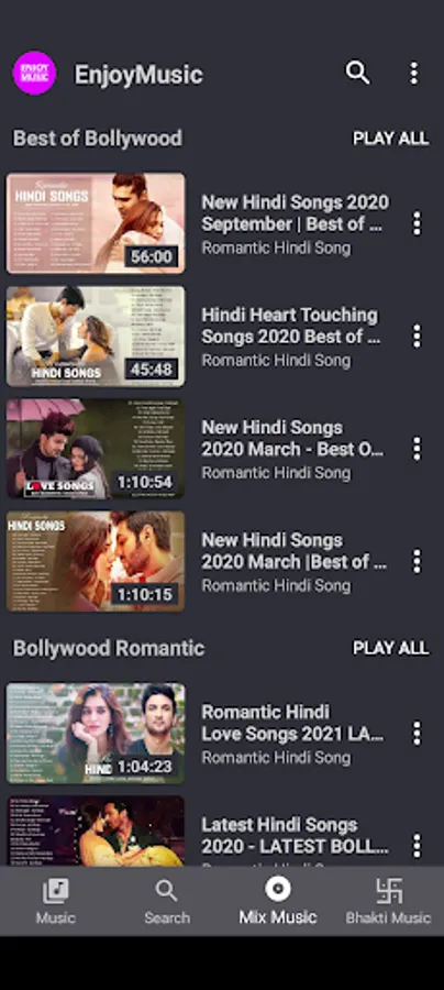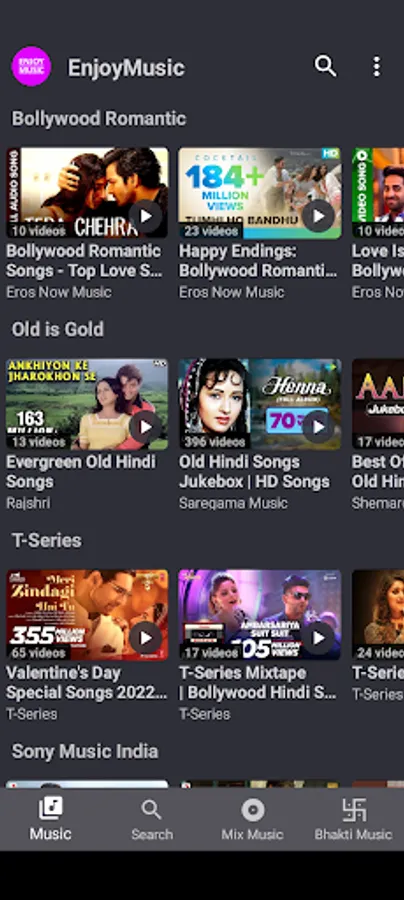 1. Static discover page for Bollywood, Bhojpuri songs; bhakti songs; mix Hindi songs