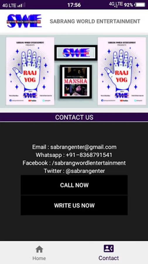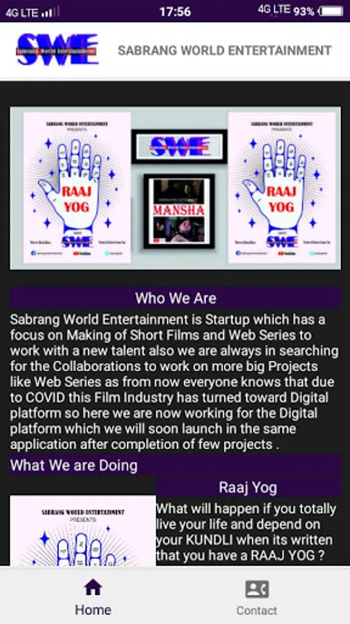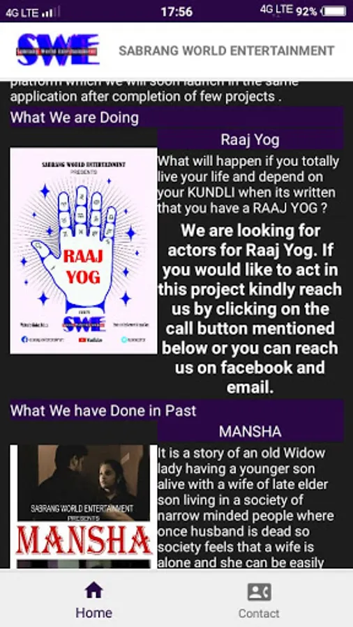 As we are a Production house so in this application we are updating our ongoing , past and upcoming projects and also we are reaching out to those who would like to act in our projects via this application as we have also implemented features to connect by call or email via this application .