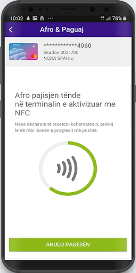 Kuleta digjitale NLB Pay digjitalizon të gjitha kartelat tuaja të pagesës MasterCard dhe Visa, dhe siguron pagesa pa kontakt përmes telefonit tuaj mobil. Pasi shitësi të ketë vendosur dhe konfirmuar shumën e pagesës, thjesht afroni telefonin tuaj mobil në terminalin POS dhe pagesa juaj ekzekutohet. Për pagesa deri në 40 EUR, nuk keni nevojë të fusni PIN kodin, ndërsa pagesat mbi 40 EUR duhet të konfirmohen me PIN kod. Të gjitha pagesat e bëra me kuletën digjitale NLB Pay shfaqen në seksionin "Detajet – Detajet e kartelës".
