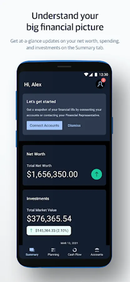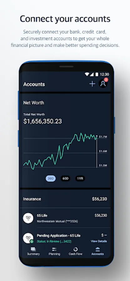 • Link all your accounts, such as banking, credit cards, retirement, investment and loans into one centralized location