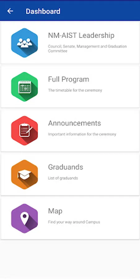 The Nelson Mandela African Institution of Science and Technology (NM-AIST) in Arusha, Tanzania will hold the 6th Graduation Ceremony on 18th August, 2022 at Tengeru Campus from 12:00 hrs. The purpose of the app is to provide key information about the ceremony.