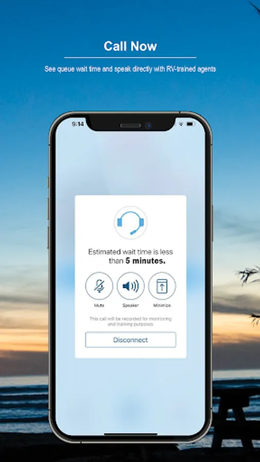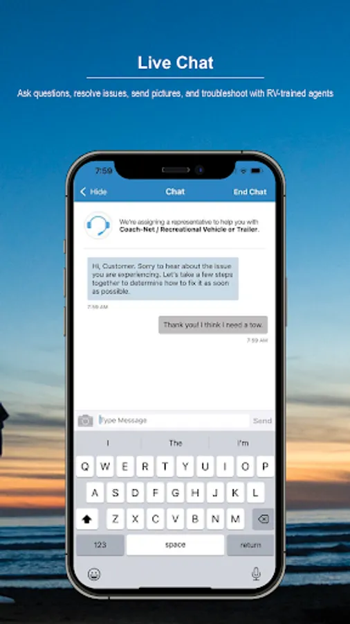 • Call Now: Request roadside assistance with a touch of a button, see queue wait time, speak directly with RV-trained agents, and send pictures to agents so the user can request the best service for their particular event situation
