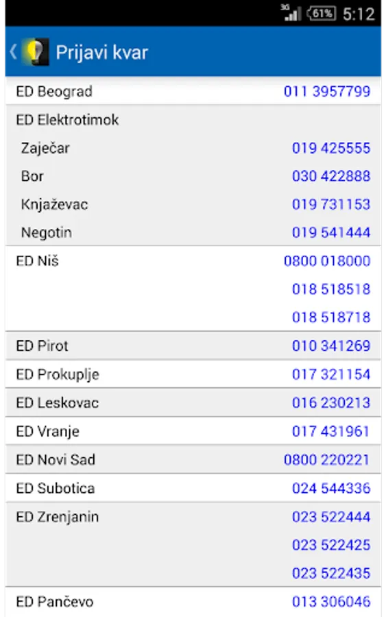 This app contains all the telephone numbers of the electricity dispatchers, so you can easily report a power outage in your neighborhood.