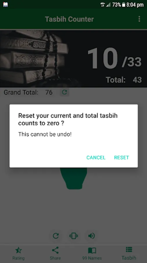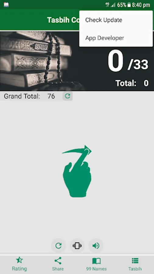 You don't have to check the screen, because digital Tasbih Counter app will give you vibration warning. You can adjust the vibration from the buttons bottom on the screen.