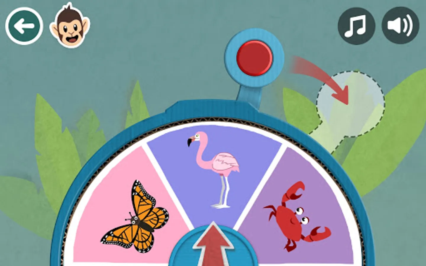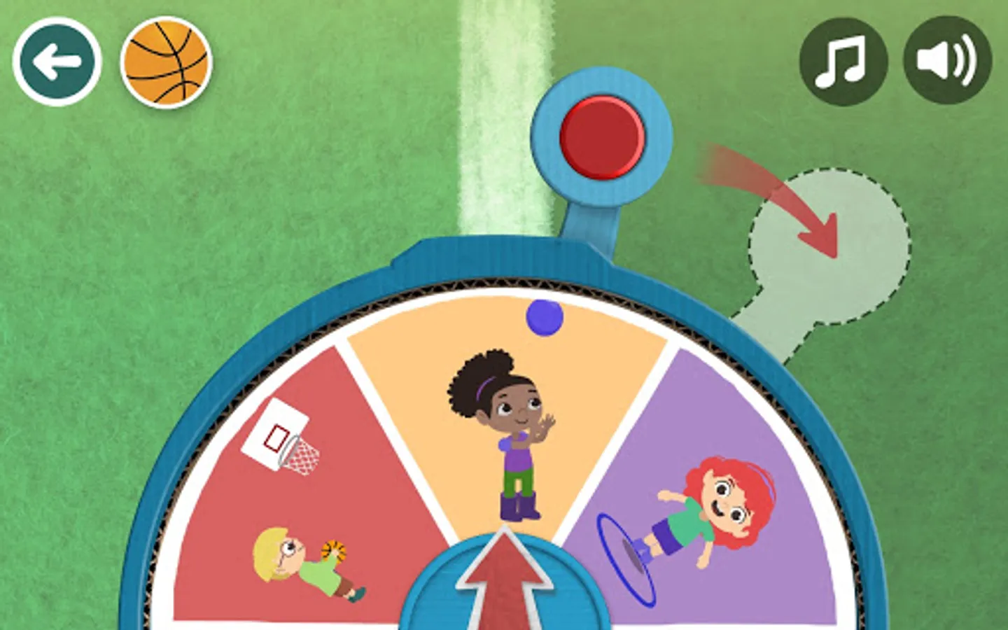 Spin the wheel to select from four sets of themed activities (Moving like Food, Moving like Animals, Playing at the Park, or Going on a Picnic).