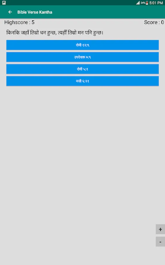 This app is made for us to remember verses from Holy Bible in easy way. It has 250 randomly selected verses from holy bible. One can play sequentially or randomly by selecting verse or verse number as quiz questions.