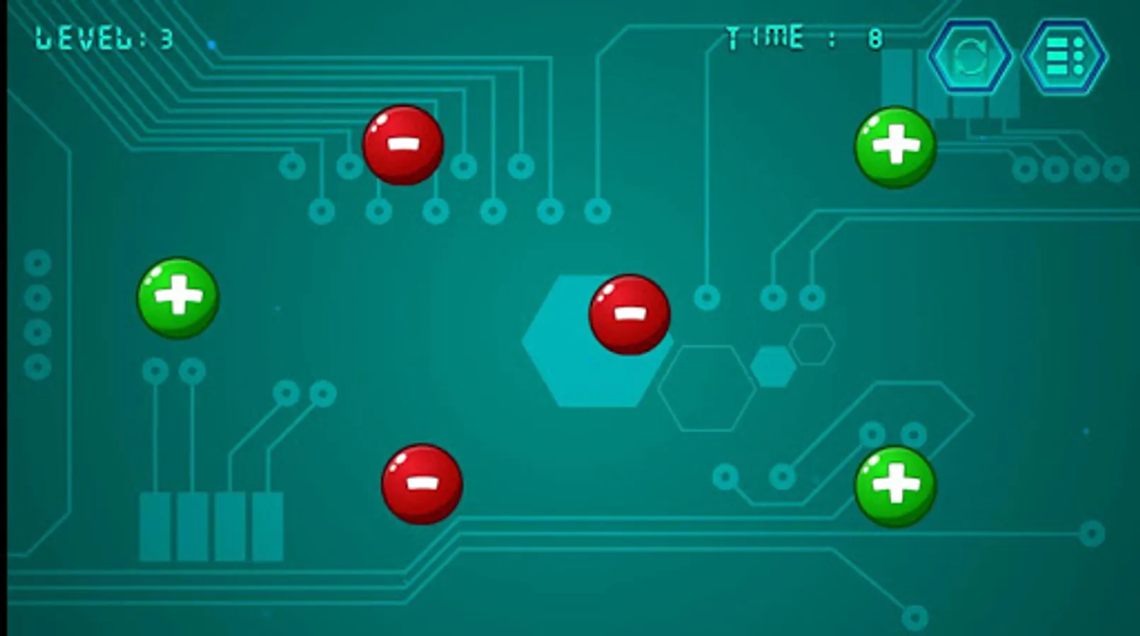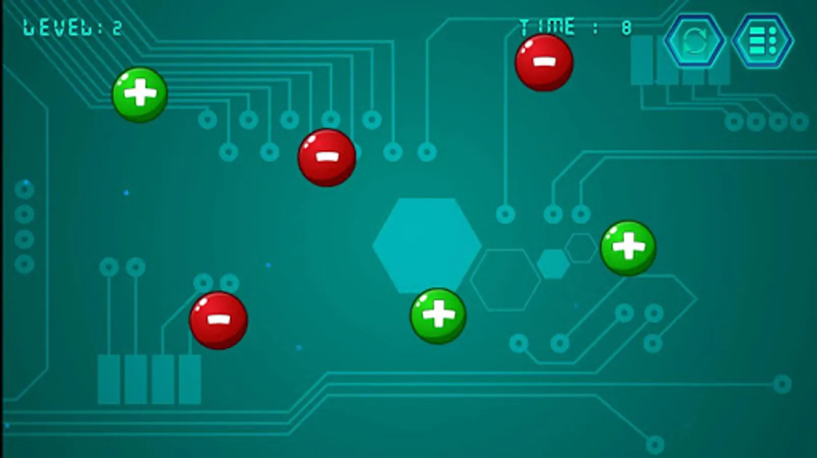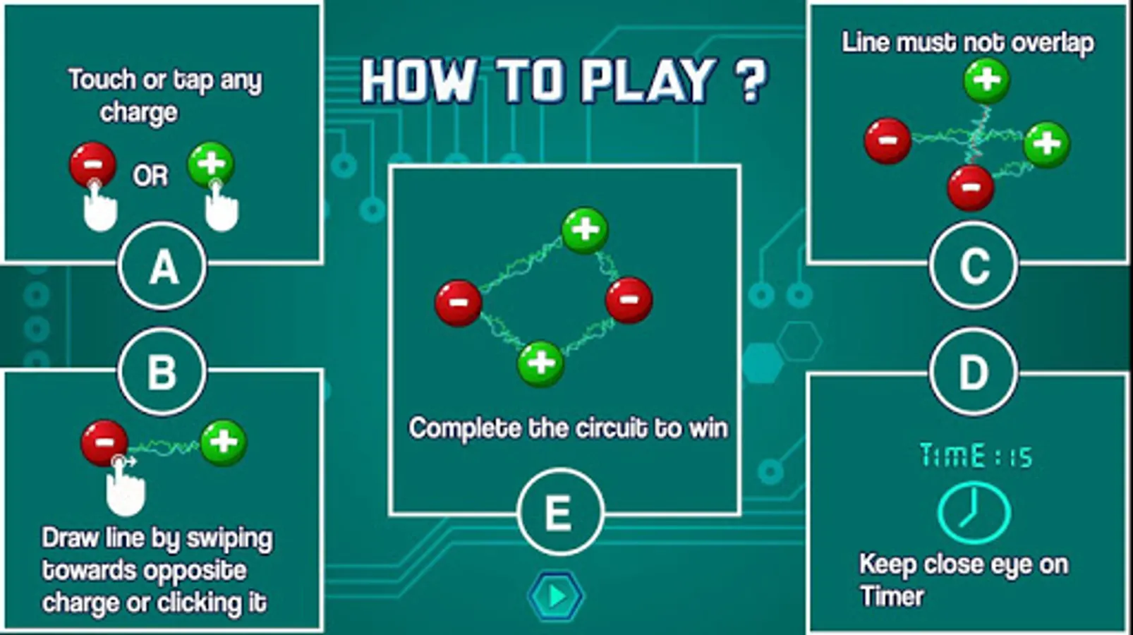 Each positive charge (plus) can connect to negative one (minus) and vice-versa. User needs to connect all of them to make a loop without overlapping the lines.