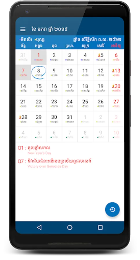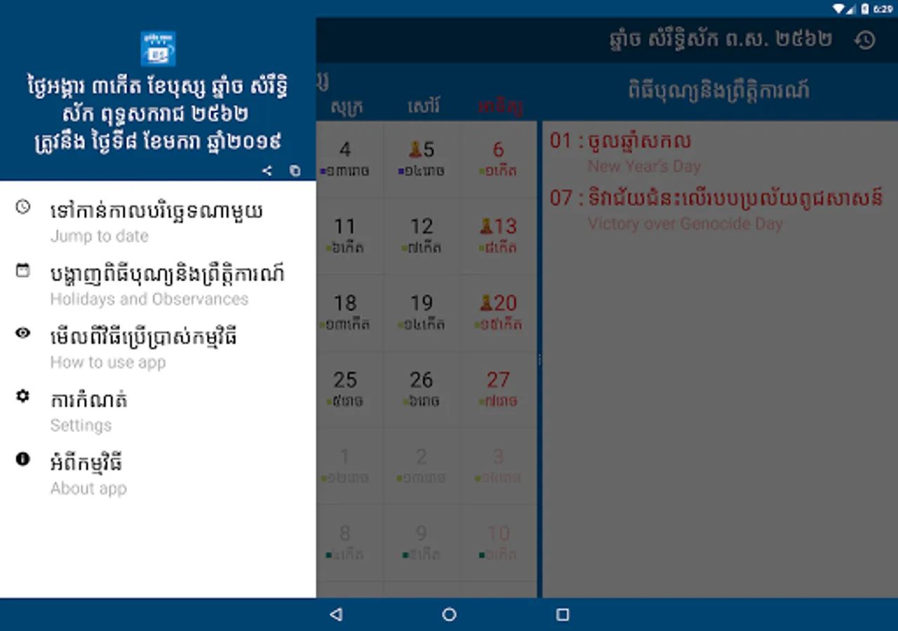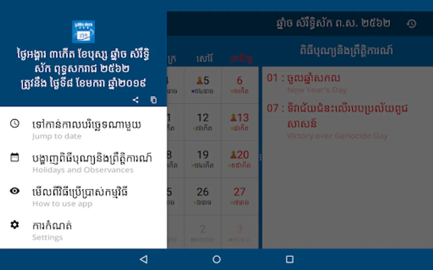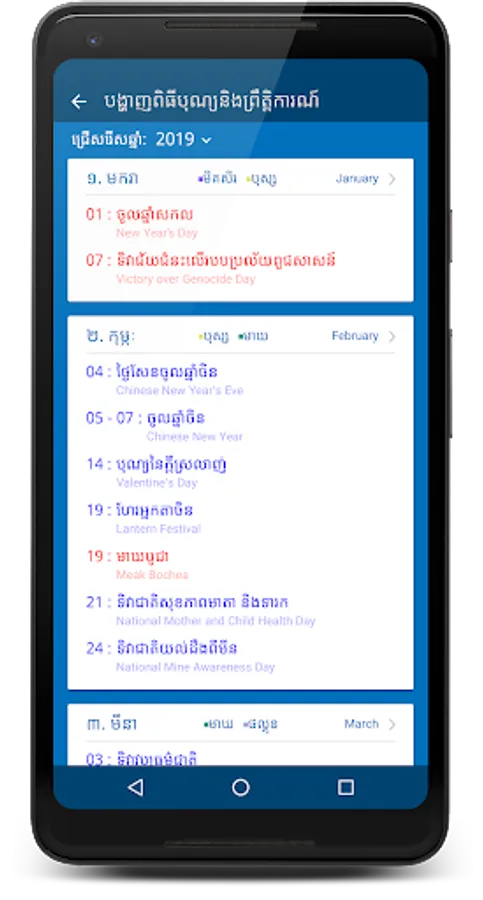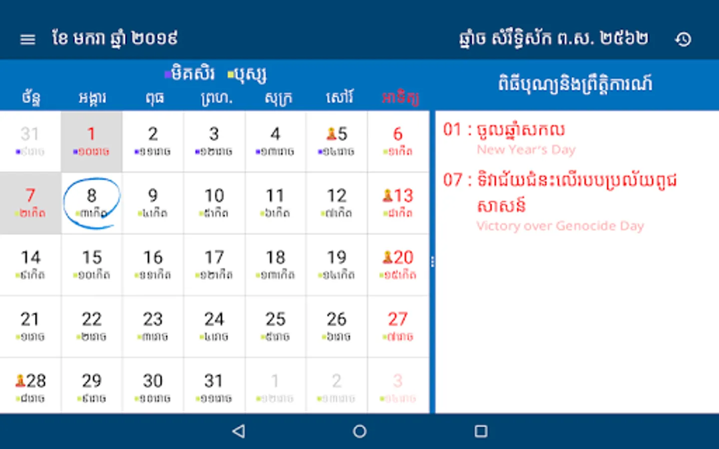 This app has build in 5000 years and include Cambodia holidays, religious ceremonies, user can create events and events are auto sync with google calendar.