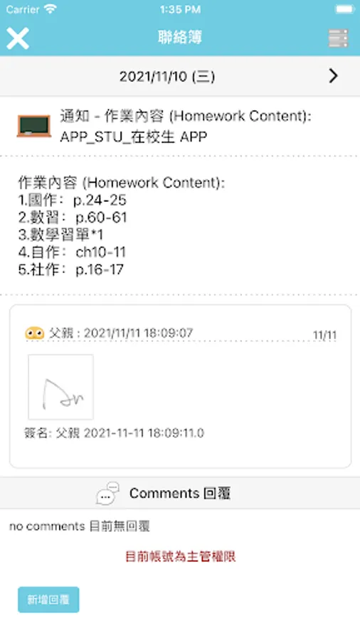 3. Contact book: Class teachers edit class content and homework to parents, and parents can reply and communicate with the teacher.