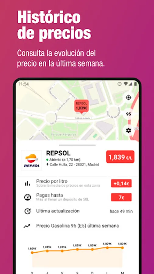 • Historical data: consult the evolution of the price in each service station in the last week.