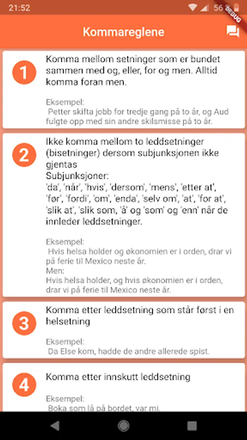 1: A list of the ten most common comma rules in Norwegian - with examples.