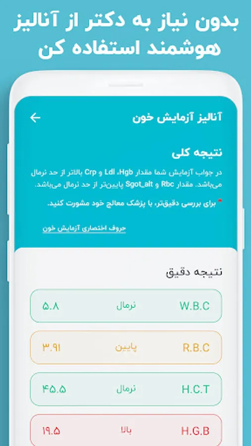 اپلیکیشن مرجع جواب آزمایش، این کار را برای شما یک قدم آسانتر هم کرده است. یعنی شما علاوه بر دسترسی کامل به معنی فاکتور های جواب آزمایش، میتوانید از بخش تحلیل هوشمند براحتی و بدون مراجعه به پزشک متخصص، خودتان برگه آزمایش را تفسیر کنید.