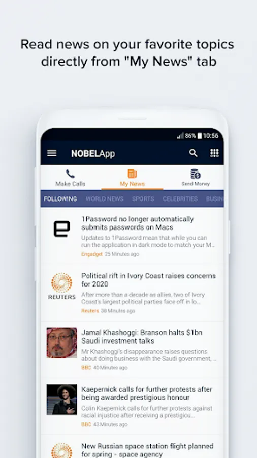 Get NobelApp, create a free account or log in using your existing NobelCom or Enjoy Prepaid account and start sending money, calling and more.