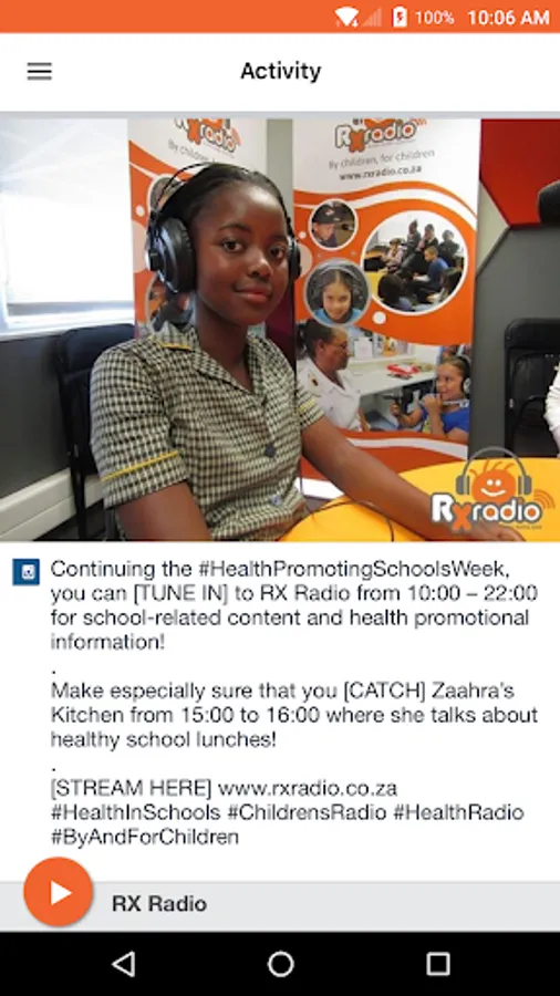 RX Radio is a children’s hospital radio station, by and for children. It strives to empower all children attending Red Cross Children’s Hospital, to tell and listen to their stories about issues that are important to them. In this way we contribute in order to improve the hospital experience and wellbeing of each child and family members.