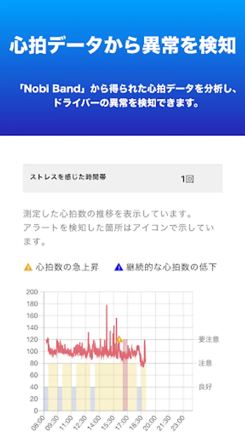 By analyzing the heart rate data acquired from the dedicated smart watch "Nobi Band" in real time, it is possible to detect alerts and visualize the health condition of the driver while driving.