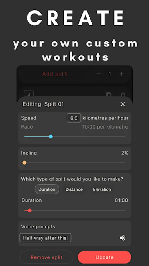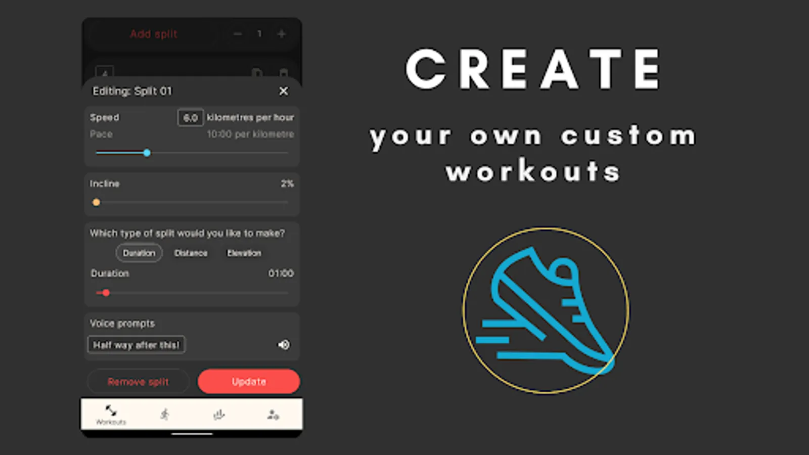 ⦿ Workout Builder - The workout builder offers flexible features to create individual workouts based on your target goals. Define your speed, incline, elevation gain, time and distance goals. Add motivational voice prompts for every split to define your own guided workout.