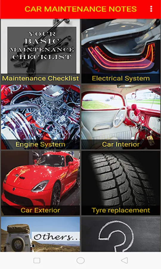 In this app of Car Maintenance Notepad you can make notes to the following item. Engine system, electrical system, car interior notes, car exterior notes, tyres and others. In others section, you can type anything you want maybe item not in the list. After this car management will be much easier. This notepad is free and easy to use.
