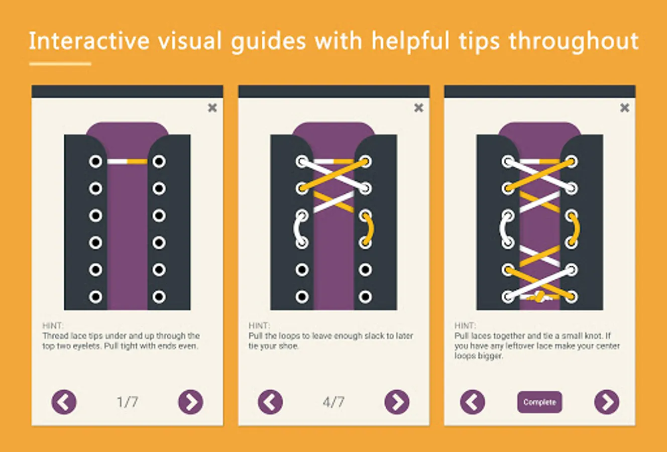 Why settle for the same old boring laces, when you can stand out in the crowd! With this app, choose from 50 lacing systems ranging from practical to decorative. Follow simple step by step tutorials to visually guide you through the lacing process.