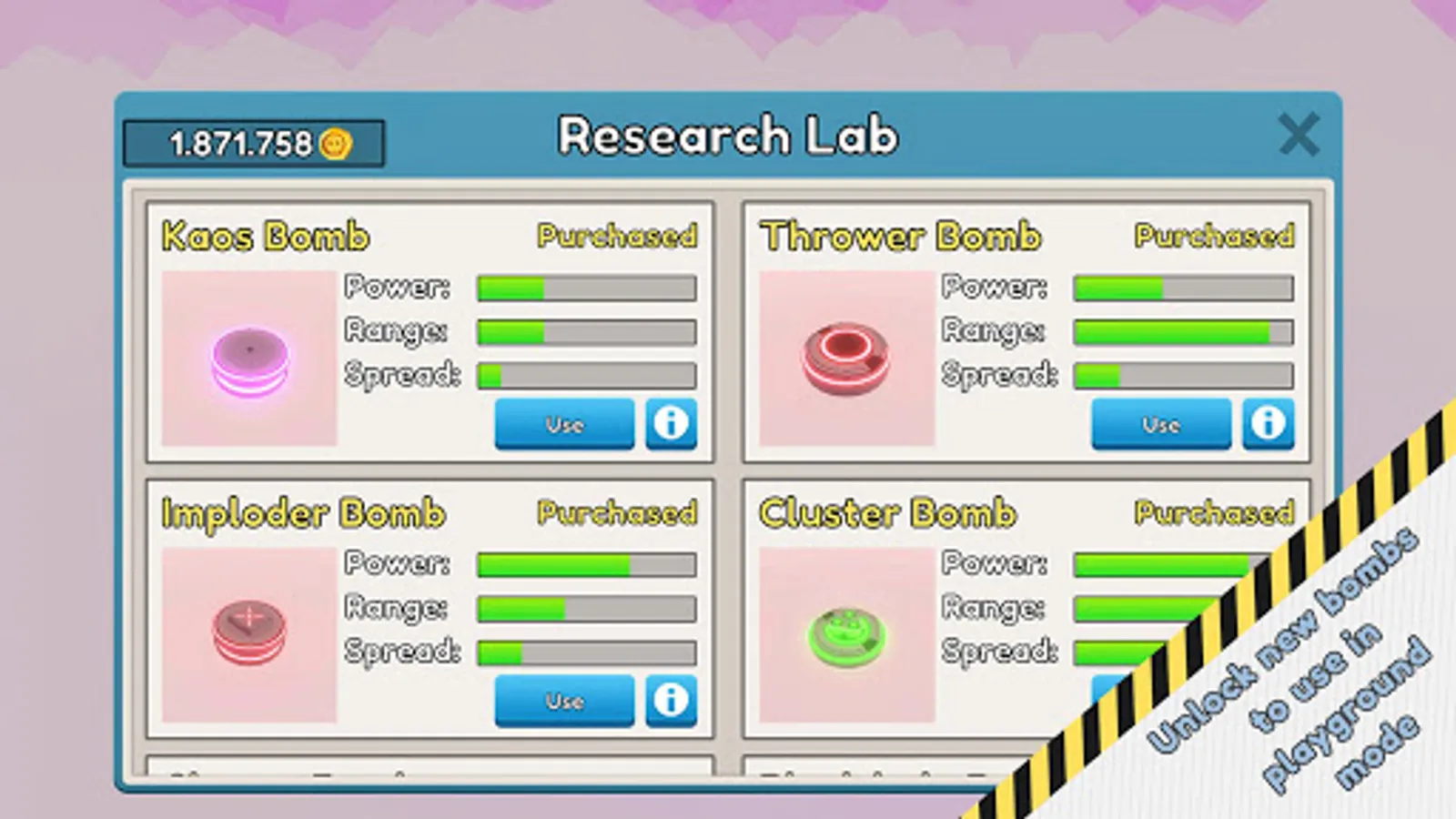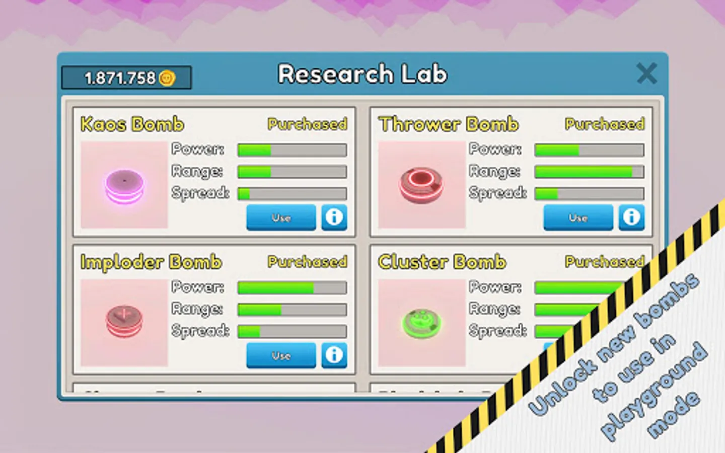 Spent your hard earned Koins to unlock new bombs and upgrades! Bigger bombs, bigger explosions, total demolition!