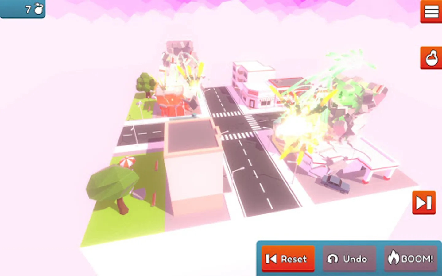 Playground mode: Every level you complete in puzzle mode, it unlocks in playground mode, where there are NO RULES! Place as many bombs as you like, combine different bombs to create a cinematic havoc! It's just "demolition and chill"