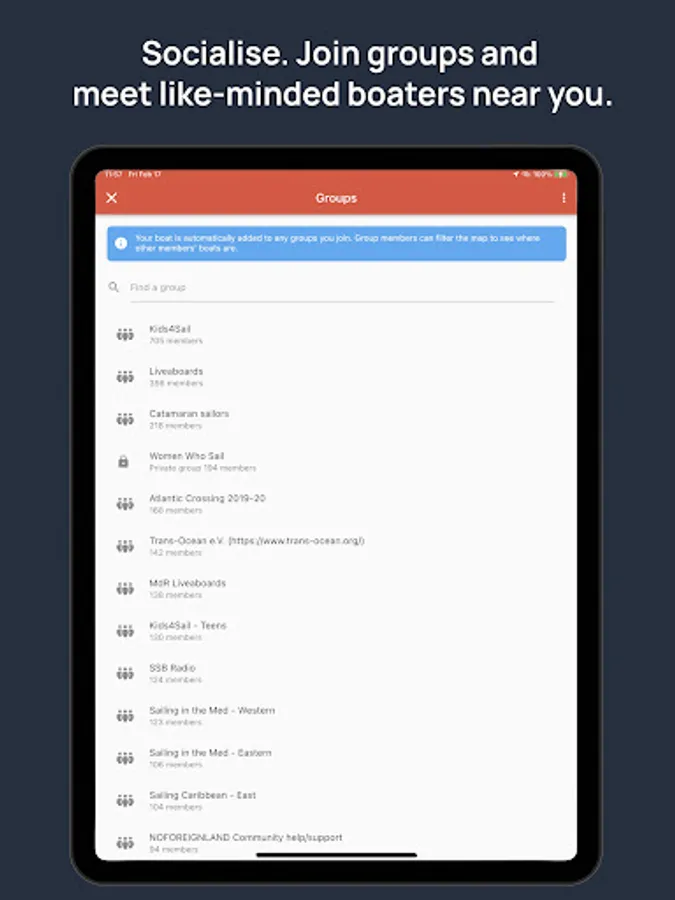 Join boat groups, and meet like-minded boaters near you. Filter the map to see other group members, and use the in-app chat to safely make contact.