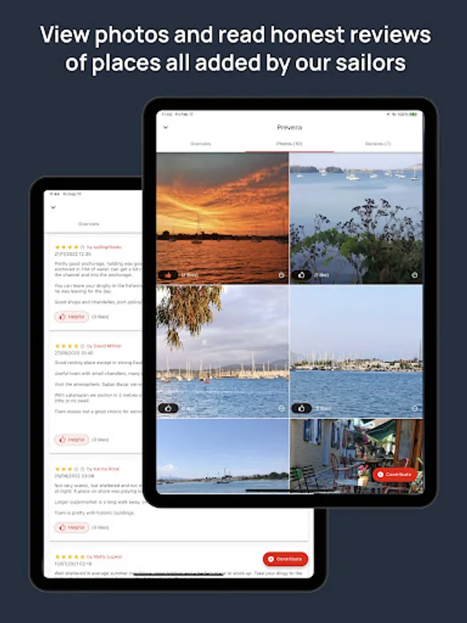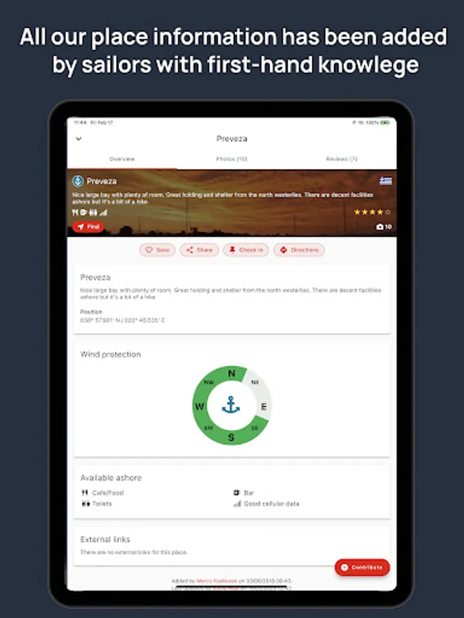 Browse through thousands of place reports added by members of our community. See photos and reviews, all added by sailors with first-hand experience. Become a contributor: add places to the map and share your photos and reviews with other sailors.