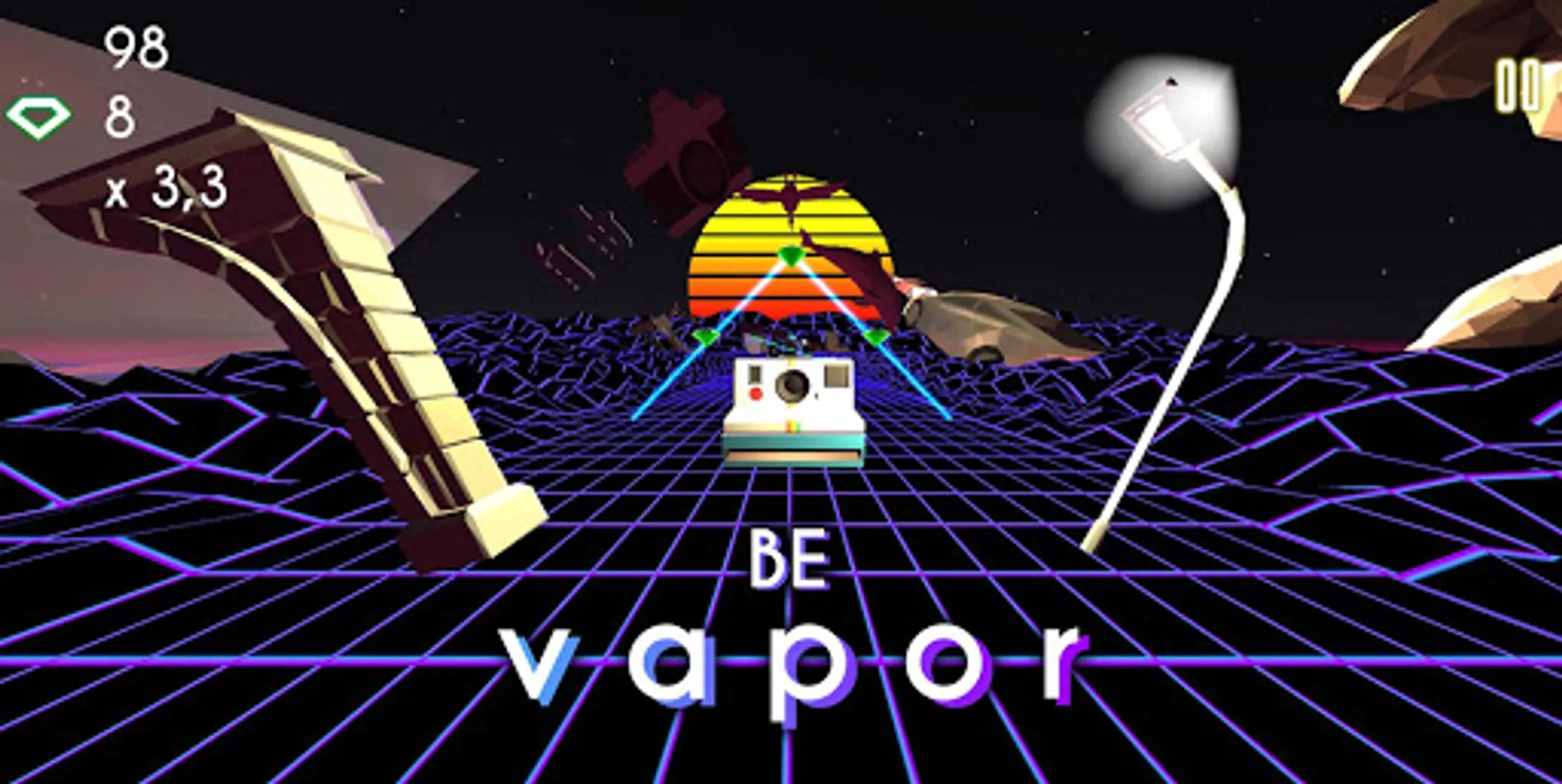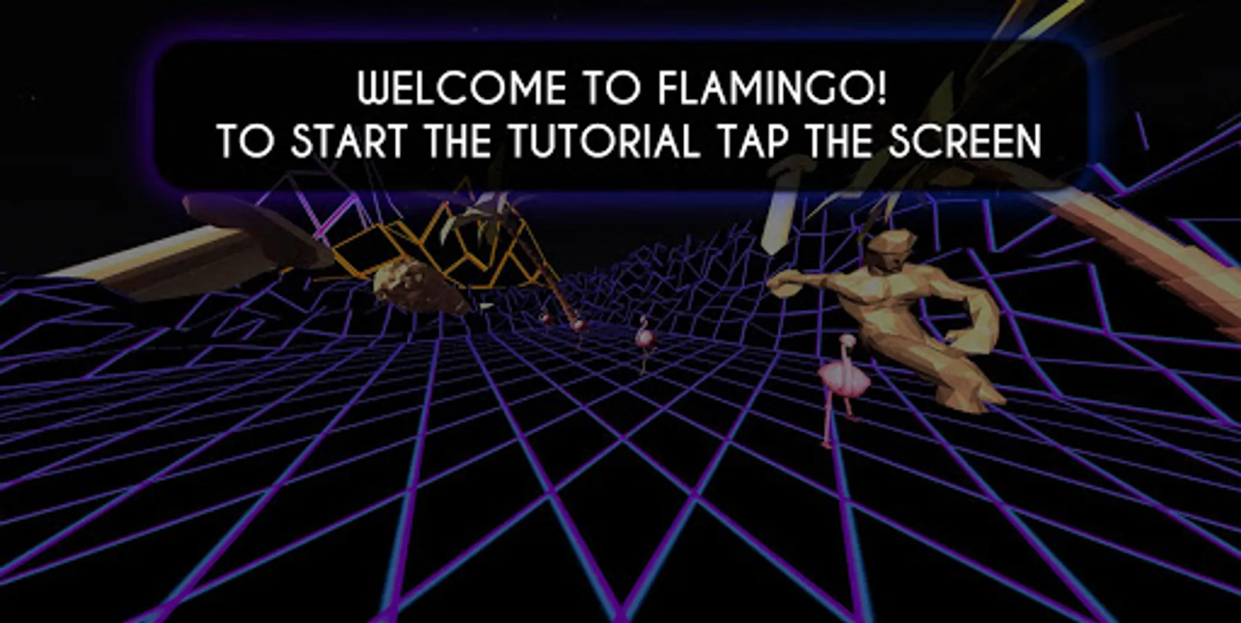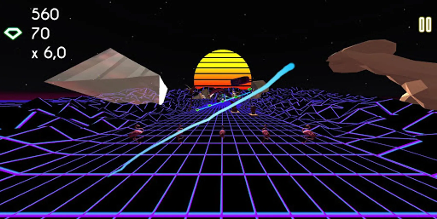 Guide a group of 5 Flamingos, draw their pattern to avoid obstacles, collect as many gems as you can to finally reach the promised V a p o r W a v e land!