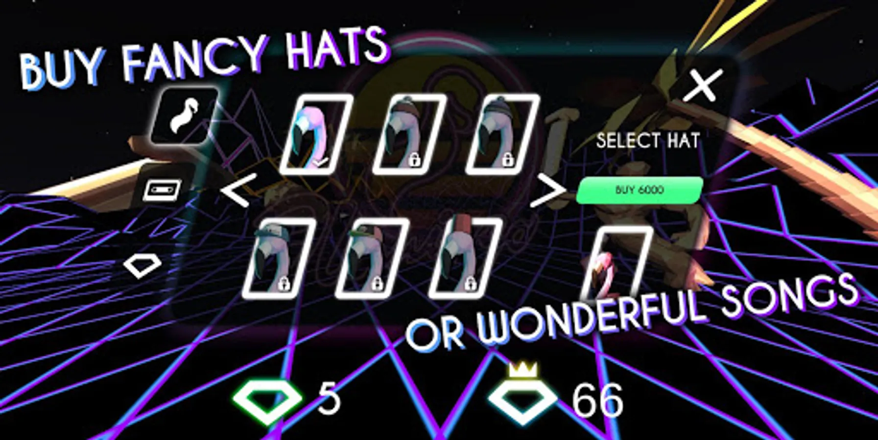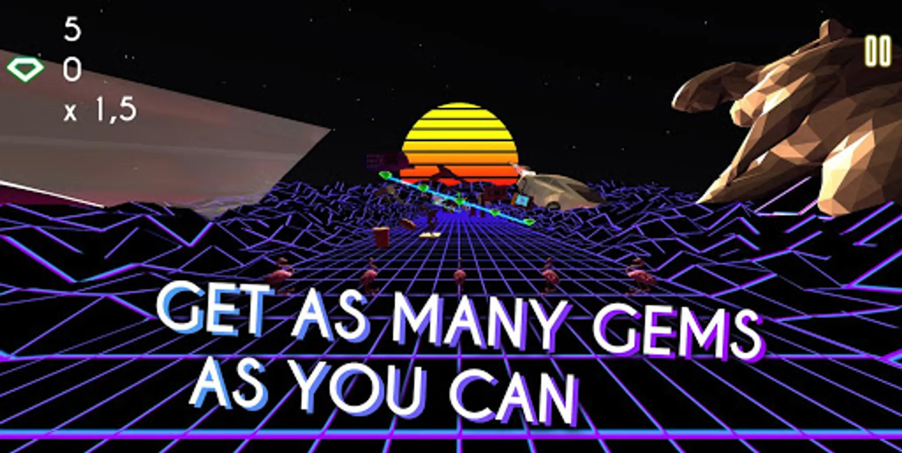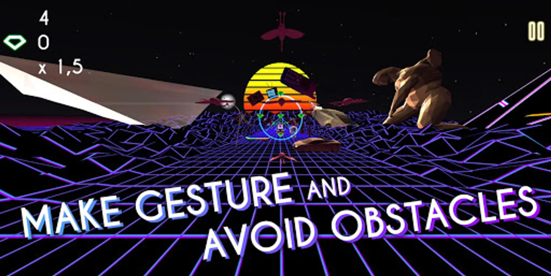 Guide a group of 5 Flamingos, draw their pattern to avoid obstacles, collect as many gems as you can to finally reach the promised V a p o r W a v e land!