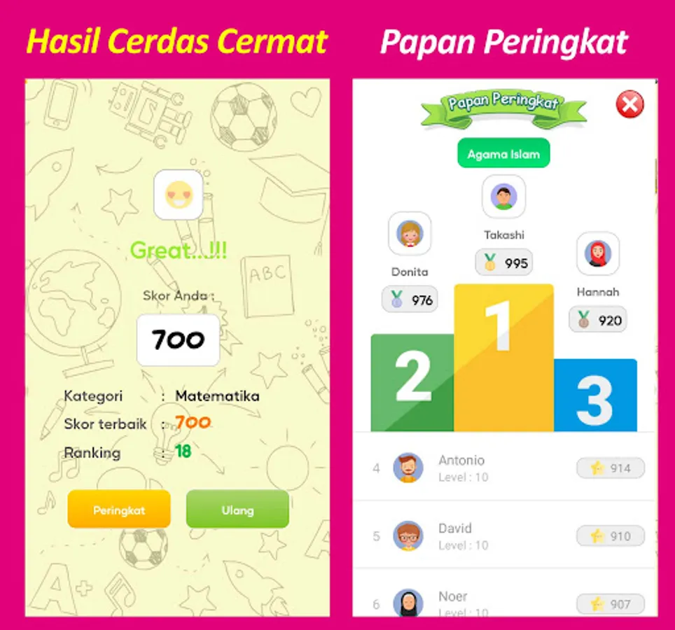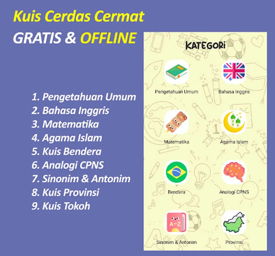 The intelligent champion application contains mixed questions from mathematics, religion, science, social studies, physics, chemistry, biology, geography, history, economics, Indonesian, English, national figures and heroes, national flags, analogies for civil servants, synonyms , antonyms, blind maps, names of provinces, capitals and general knowledge. So it is highly recommended to sharpen the brain and add insight