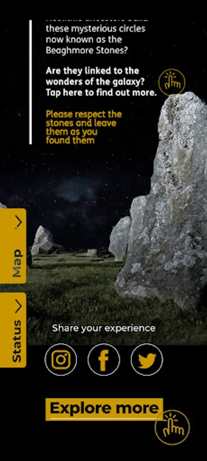 Finally, at the end of the trail, you will reach a spectacular prehistoric monument called the Beaghmore Stones. No one knows for sure why our Neolithic ancestors built it. But it's thought that the monument's mysterious stone circles might be aligned to some galactic pattern in the night sky. A breathtaking 3D experience can tell you more by showing how the landscape surrounding the monument has evolved over time.