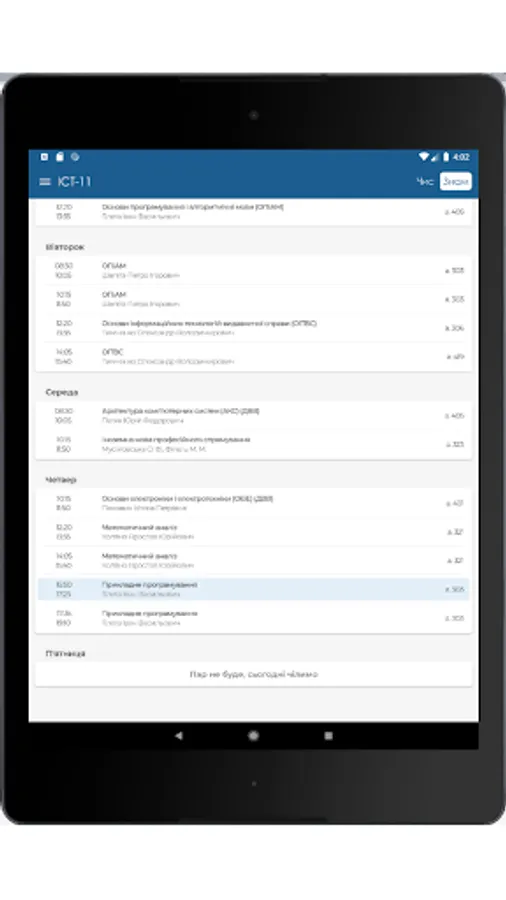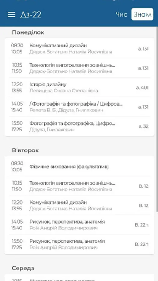 One of the main advantages of the UAD Interactive Schedule is its readable and convenient interface. The schedule is presented in an understandable format, which allows students to quickly navigate their study schedule. The application automatically determines the type of week (denominator or numerator) and displays this information in understandable symbols.
