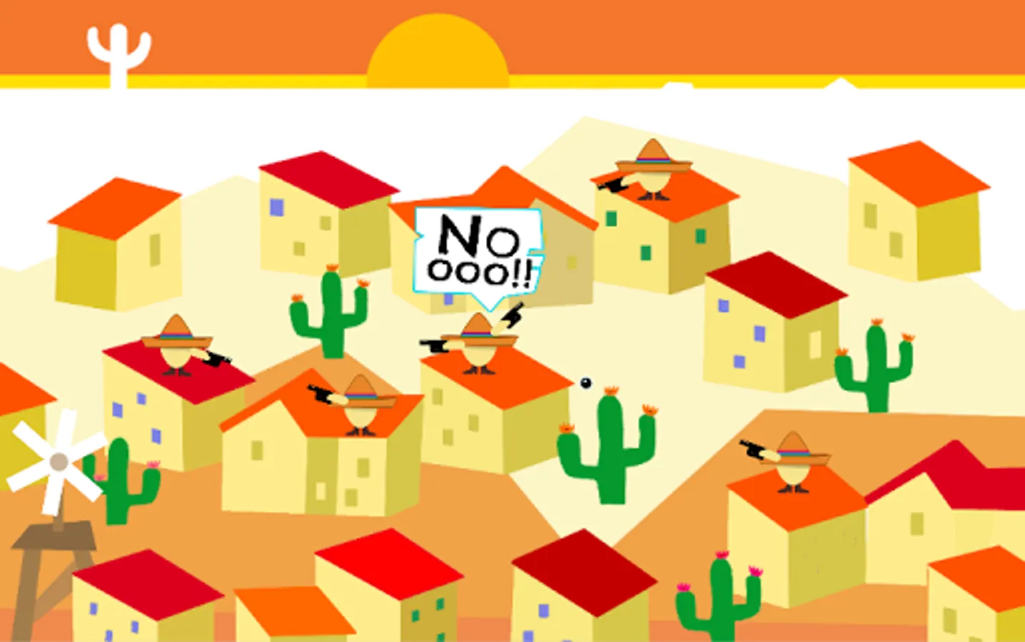 Enjoy a Mexican-standoff simulation! This is a Mexican standoff in a literal sense implying subtle moral choices. The game has plenty of drama and tequila, a dedicated soundtrack and teaches important although basic elements of graph theory and ballistics. Inhabitants of a stereotypical Mexican pueblo are equipped with guns and stuck in a scary mutual-threat scenario. What do they do now?