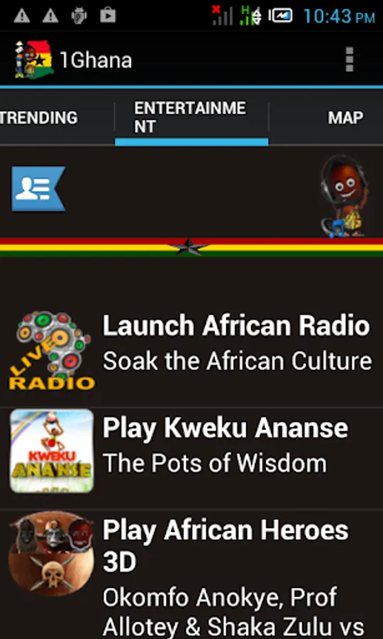➤Entertainment - Listen to thousands of African radio stations live. Choose to listen to particular music, artists and programs. Track artistes, songs and programs being played by radio stations, and rate radio stations. You can also have access to latest Ghanaian themed video games such Kweku Ananse, African Heroes – Okomfo Anonkye, Shaka Zulu, Professor Allotey etc