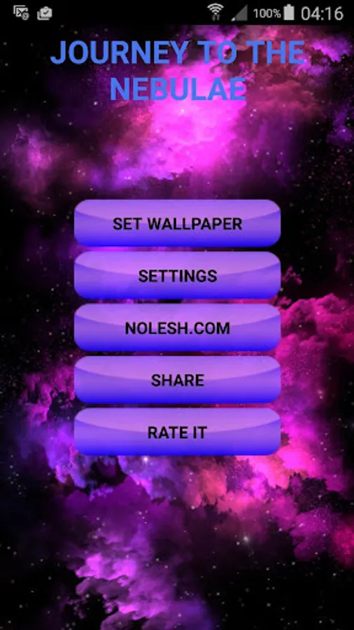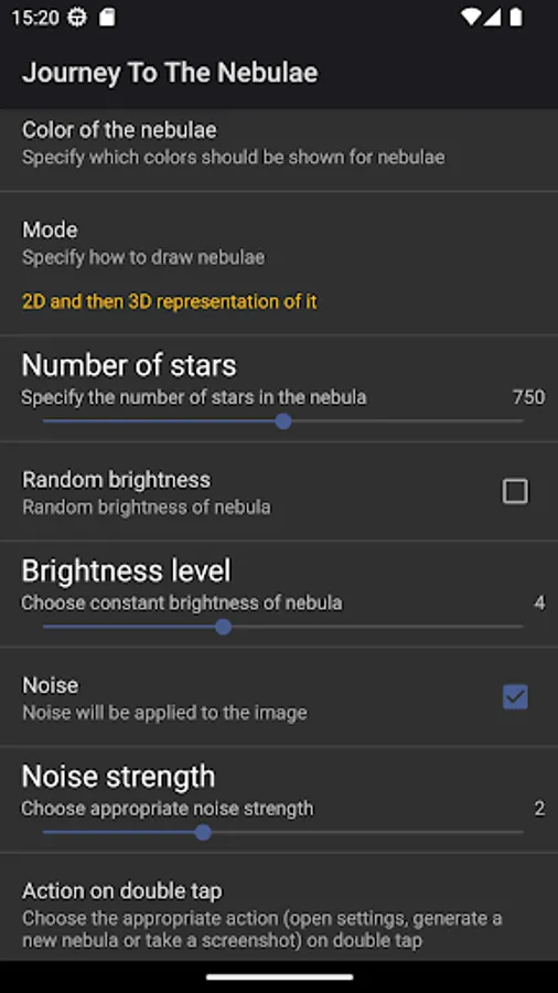 This live wallpaper and Daydream (4.2+) will tell you about the unimaginable nebulae in deep space. Imagine yourself as an astronaut who travels through the universe in search of new nebulae that has not been discovered yet. In this journey you will discover countless amazing nebulae. This live wallpaper has algorithm which generate nebulae randomly. So, you will never see the same nebula! The scene of the approaching nebula can be displayed in 2D or pseudo-3D modes. If you like the nebula which is shown on the screen, you can take a screenshot of it! Also you can apply noise effect to the image.