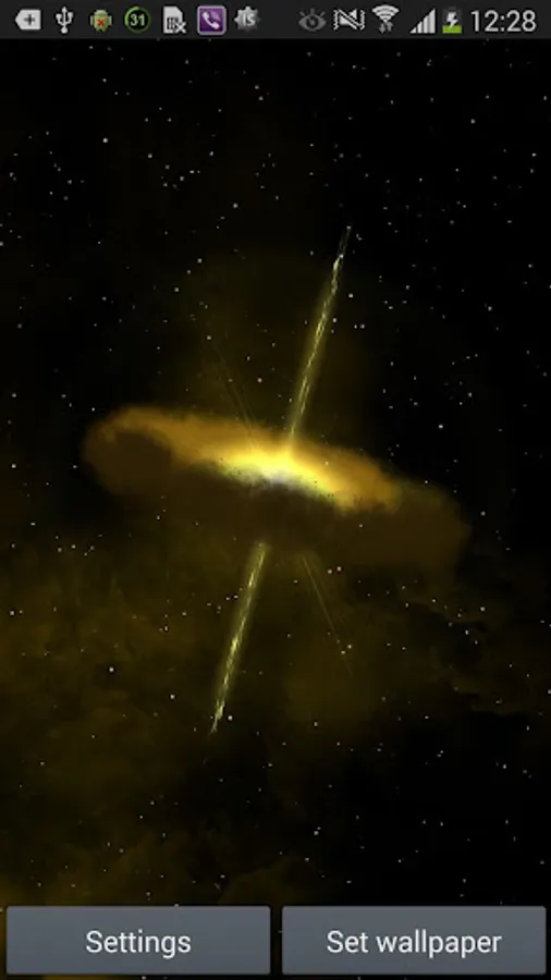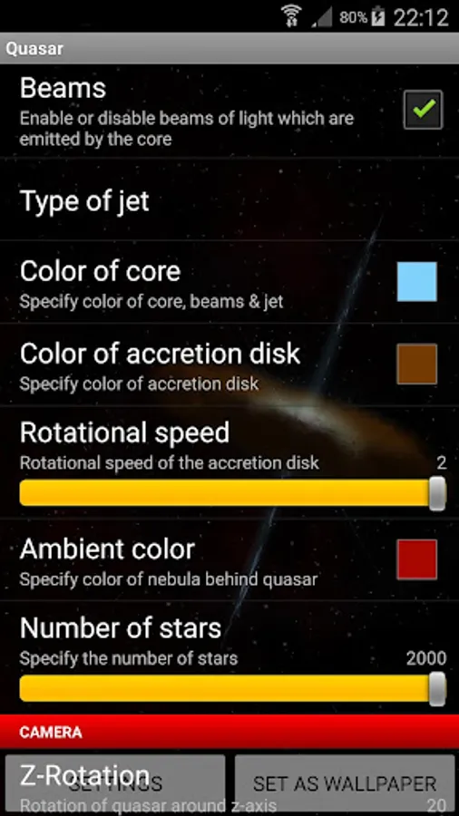 Would you ever dream to see the most dangerous and mysterious object in universe? This live wallpaper and Daydream(4.2+) makes this dream comes true! A quasar is a compact region surrounding a supermassive black hole and emitting enormous amounts of electromagnetic energy as mass from the core of a surrounding galaxy, under the influence of the black hole's gravity, falls onto its accretion disk. Create your own quasar using a big number of settings such as color of the core and jet, substance and ambient, rotational speed, angle of inclination etc. Behind the quasar you can see amazing nebula which is created dynamically. Thus, the environment will be always varied.